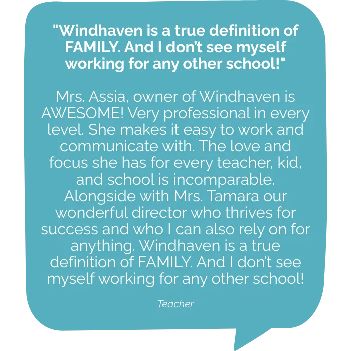 Moving my daughter to Windhaven was the best decision we made. The entire staff are very professional, awesome and so genuine. It’s very easy to communicate with the front office and directly with her teacher. The structure and organization is what we were looking for. I couldn't ask for better caretakers for my child. Ms.Bailey loves her and treat her as her own and every morning she wakes up super excited to go.